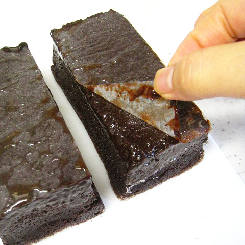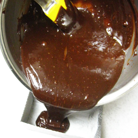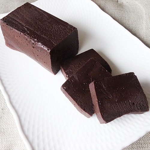 これはもうほとんどチョコレートガナッシュそのもの、と言っていいくらい濃厚でチョコレート好きにはたまらないお菓子です。チョコレートにバター、卵、砂糖を加え、つなぎにほんのちょっぴり粉を入れてじっくり蒸し焼きにするだけですが、ねっとりとした食感と濃厚な風味はやはりビターチョコレートで作るからこそのお味。十分に冷やしたら、薄切りにして少しずつお楽しみください。