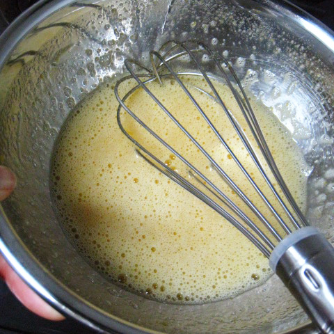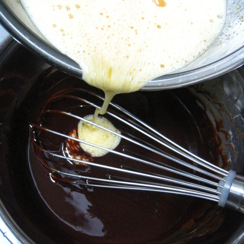 別のボールに卵と砂糖を入れてよく溶き湯せんにかけて温める。混ぜながら温め、ひと肌より温かいくらいにする。(つめたい卵だとチョコレートとバターが冷えて生地がしまってしまう)