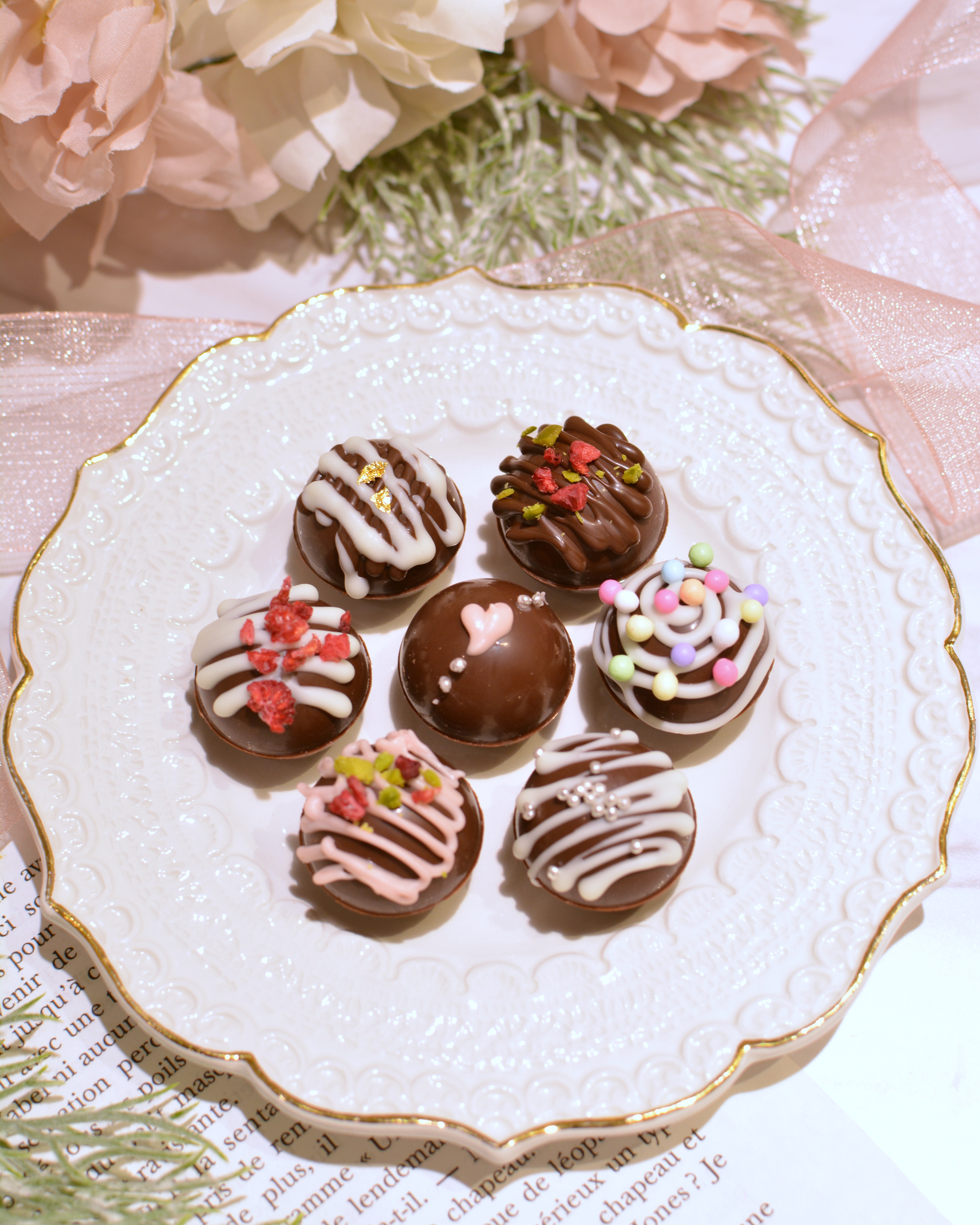 出来上がったガナッシュクーゲルンの表面にはお好みのチョコレートやお菓子で、