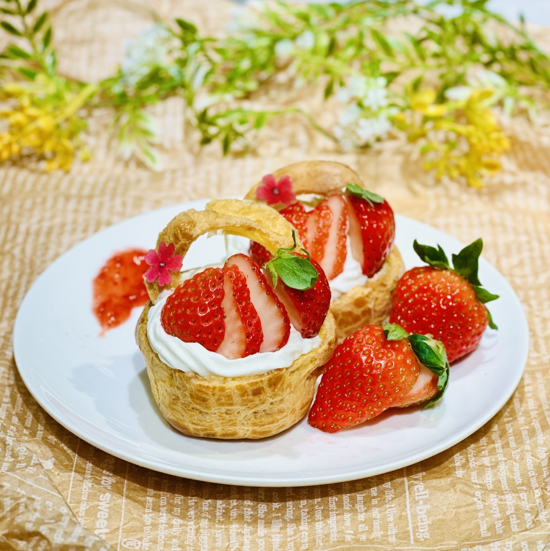 まるで花かごのような小さなシューのバスケットにたっぷりのカスタードクリームといちごジャムを詰め込みました。