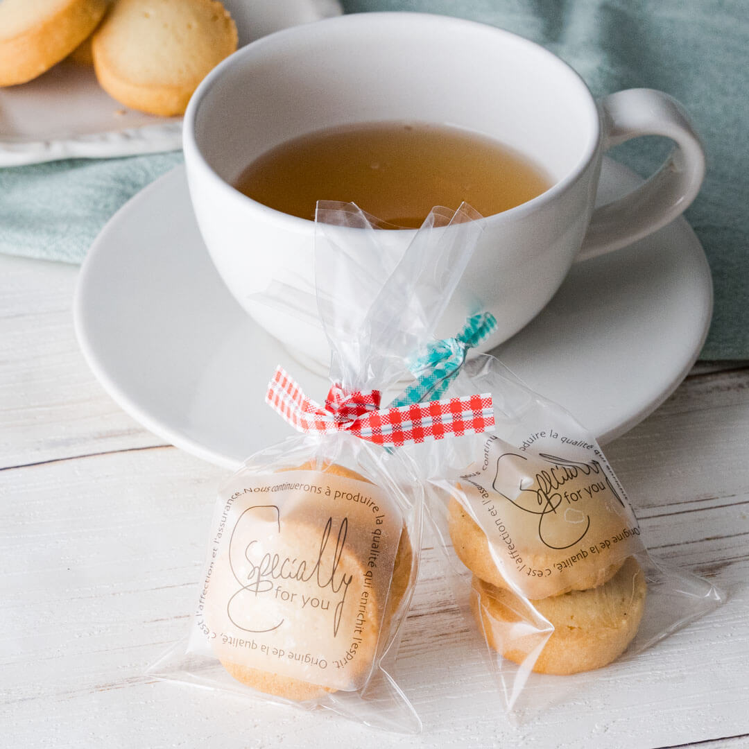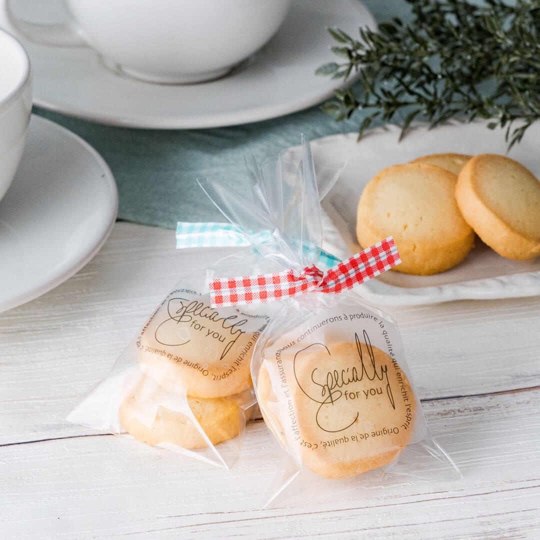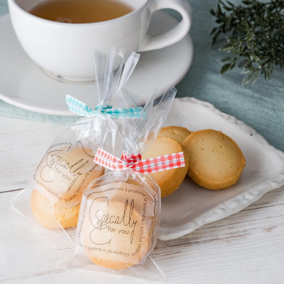 OPP袋に透明のシールを貼るだけでワンランクアップした印象になり、ギンガムチェックのタイが少しレトロでキュートな仕上がりになります。