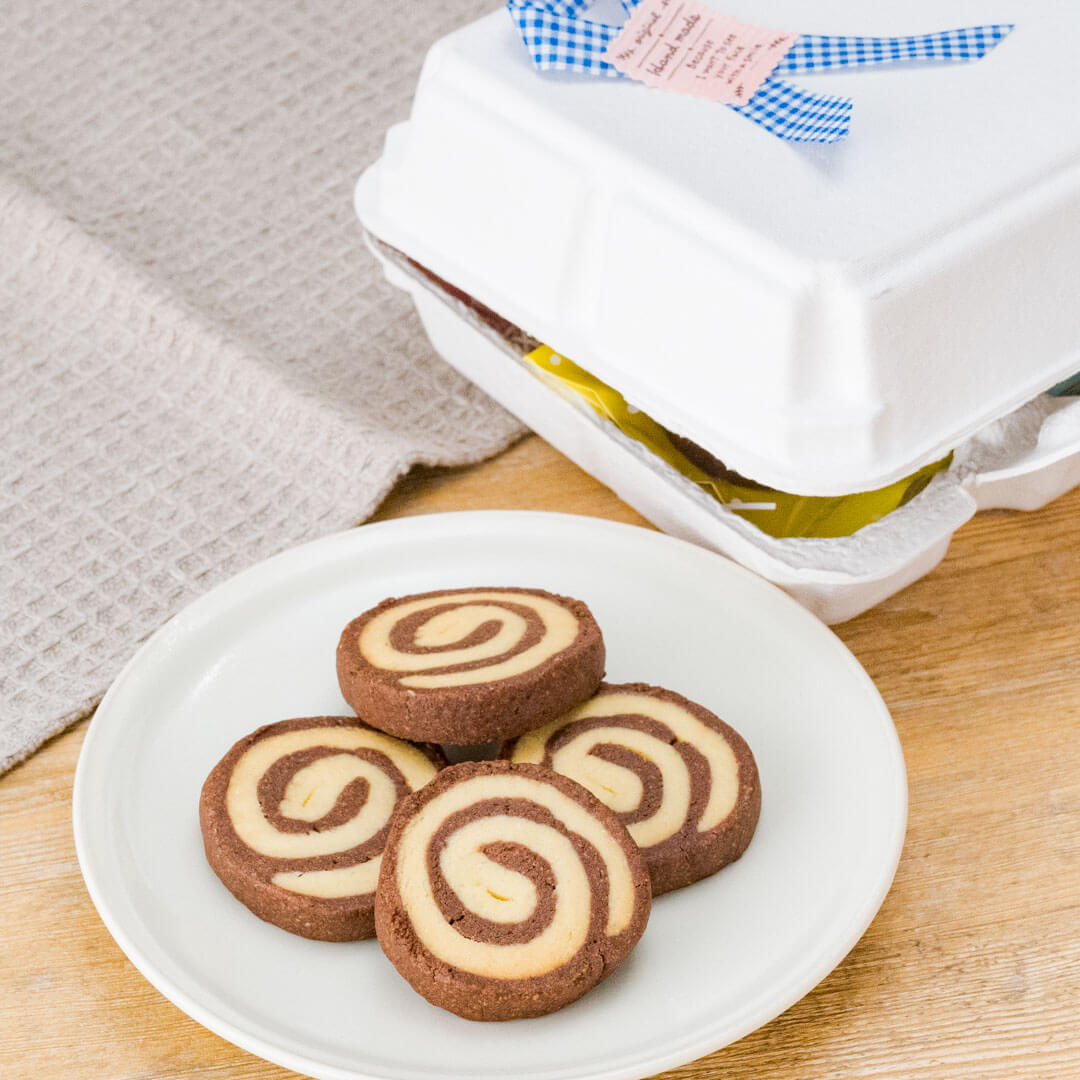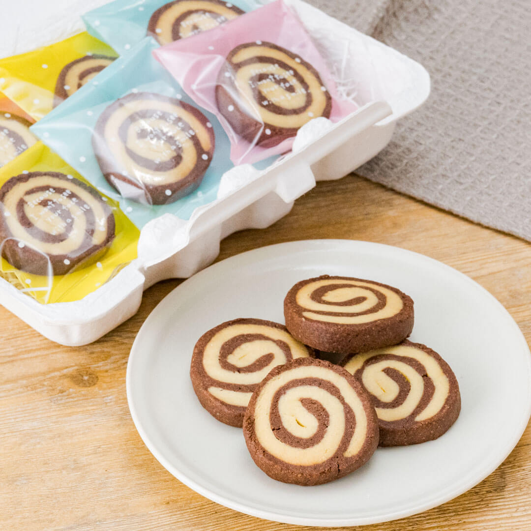 カラフルなガス袋を使ったうずまきクッキーのラッピング。