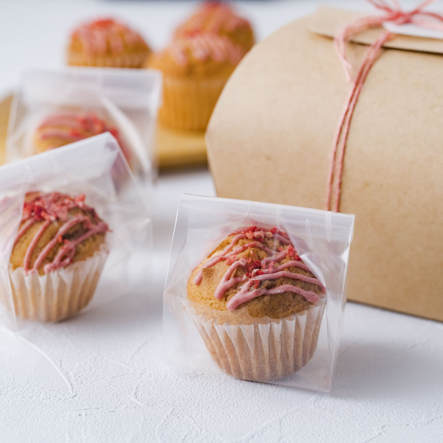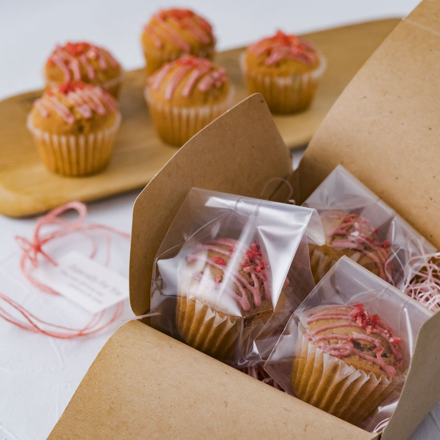 リボンにかけるタイプのタグをつけた箱が可愛らしいミニマフィンのラッピング。