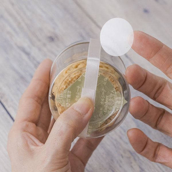 ペットジャーの側面でリボンが動かないようにギフトシールを貼る。