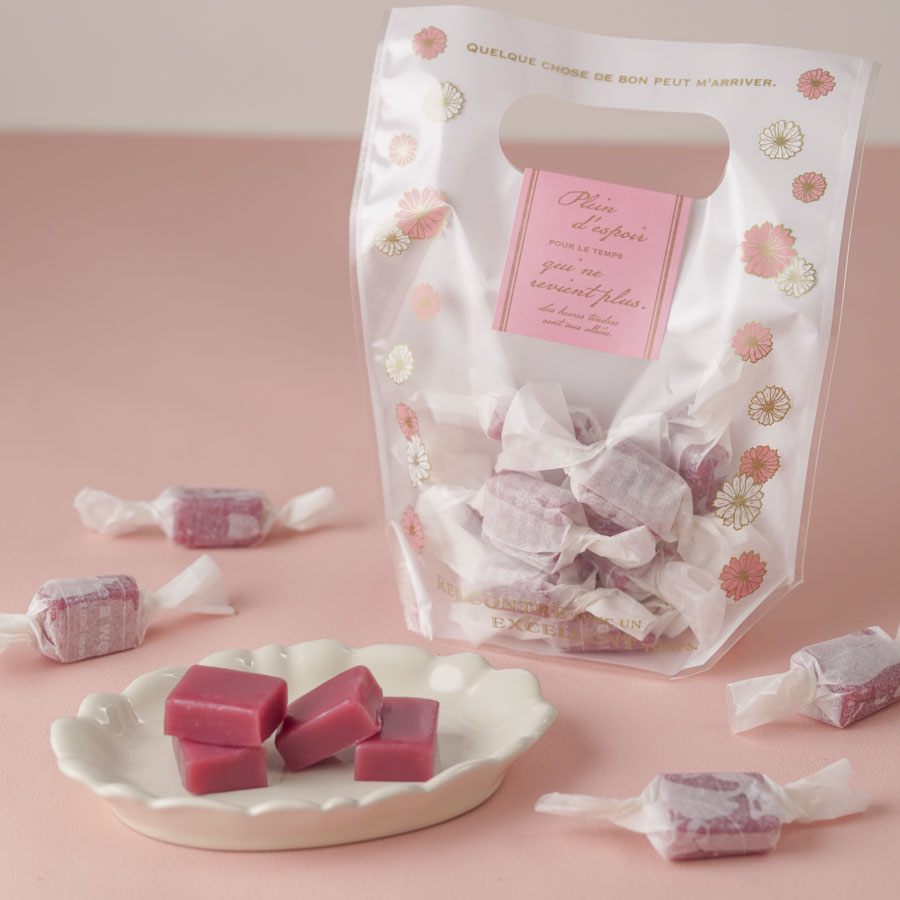 柄入りで中身が見えるタイプの袋で、フランボワーズの色味とマッチしていて可愛らしいラッピングです。