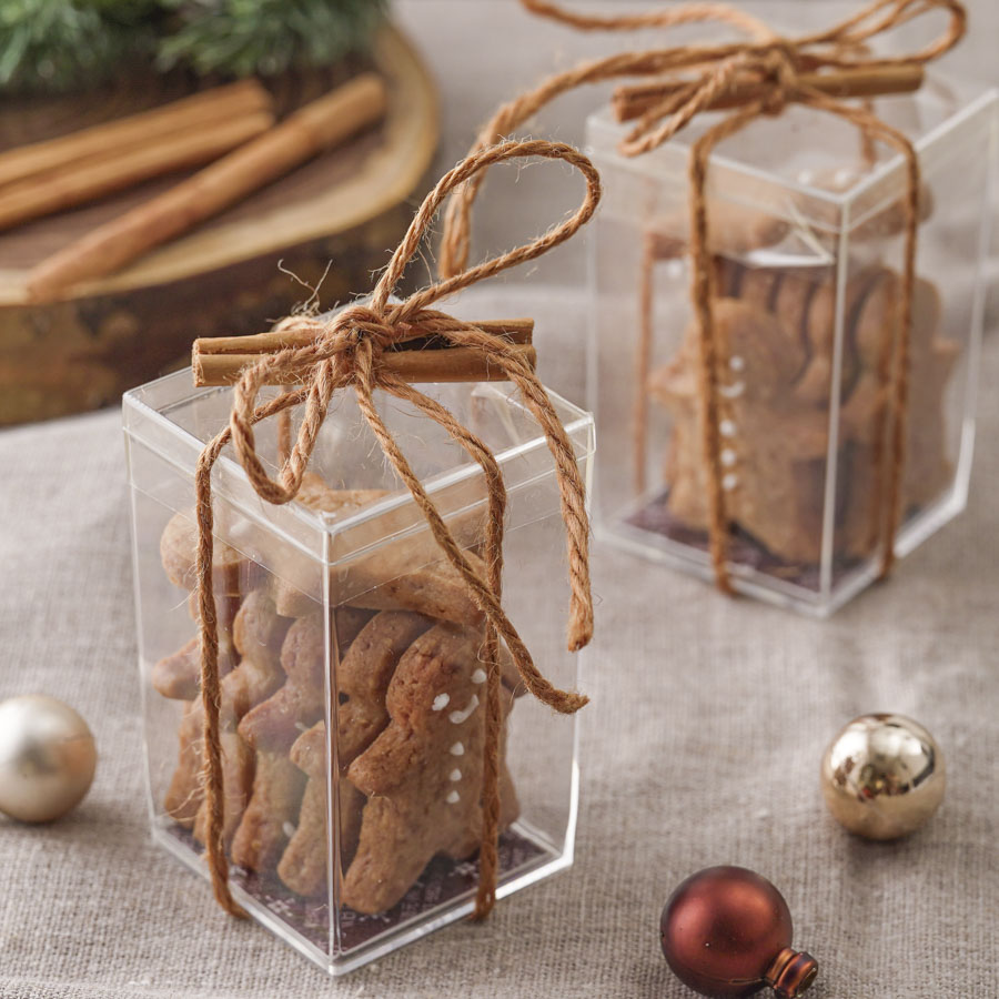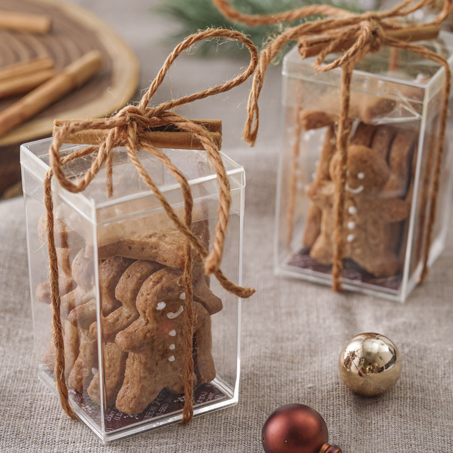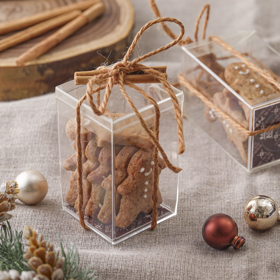 可愛くアイシングで描いたジンジャーマンがしっかりと見えるクリアケースを使ったラッピング。