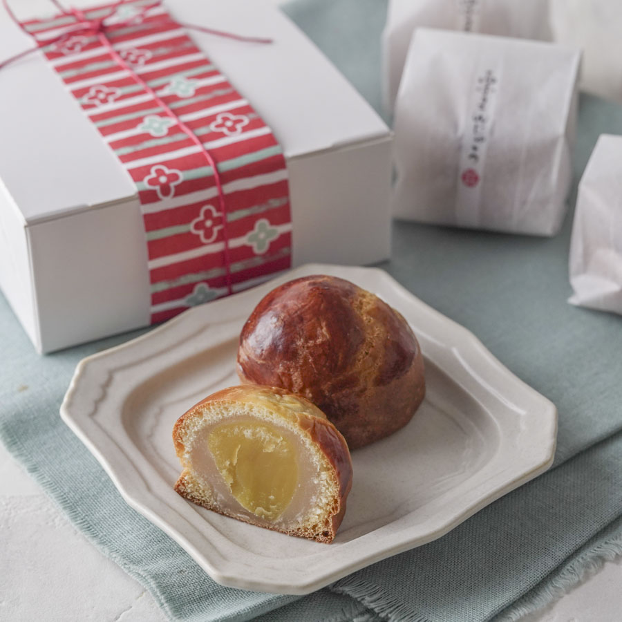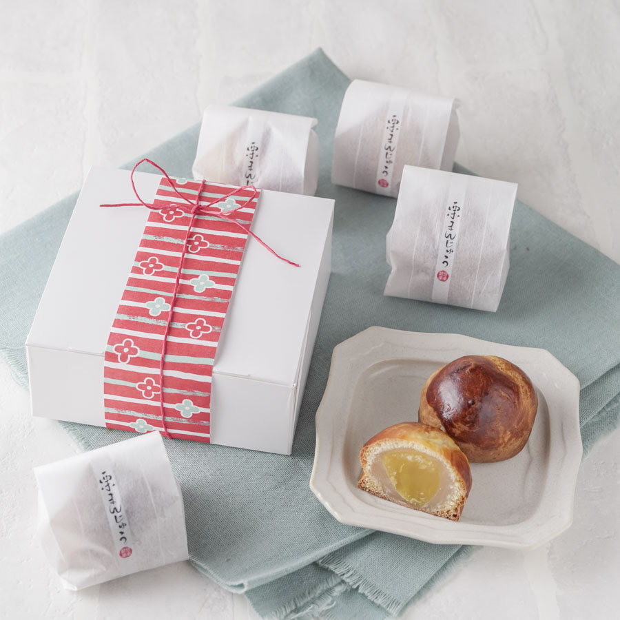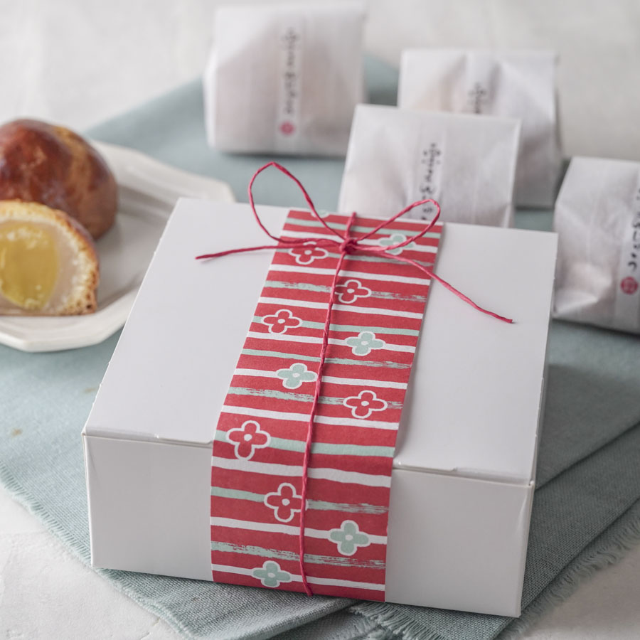 栗まんじゅう用の袋で個包装し、箱に詰め合わせた栗まんじゅうのラッピング。