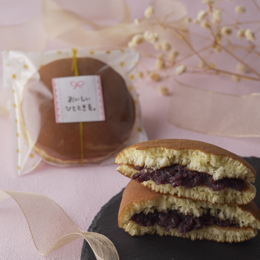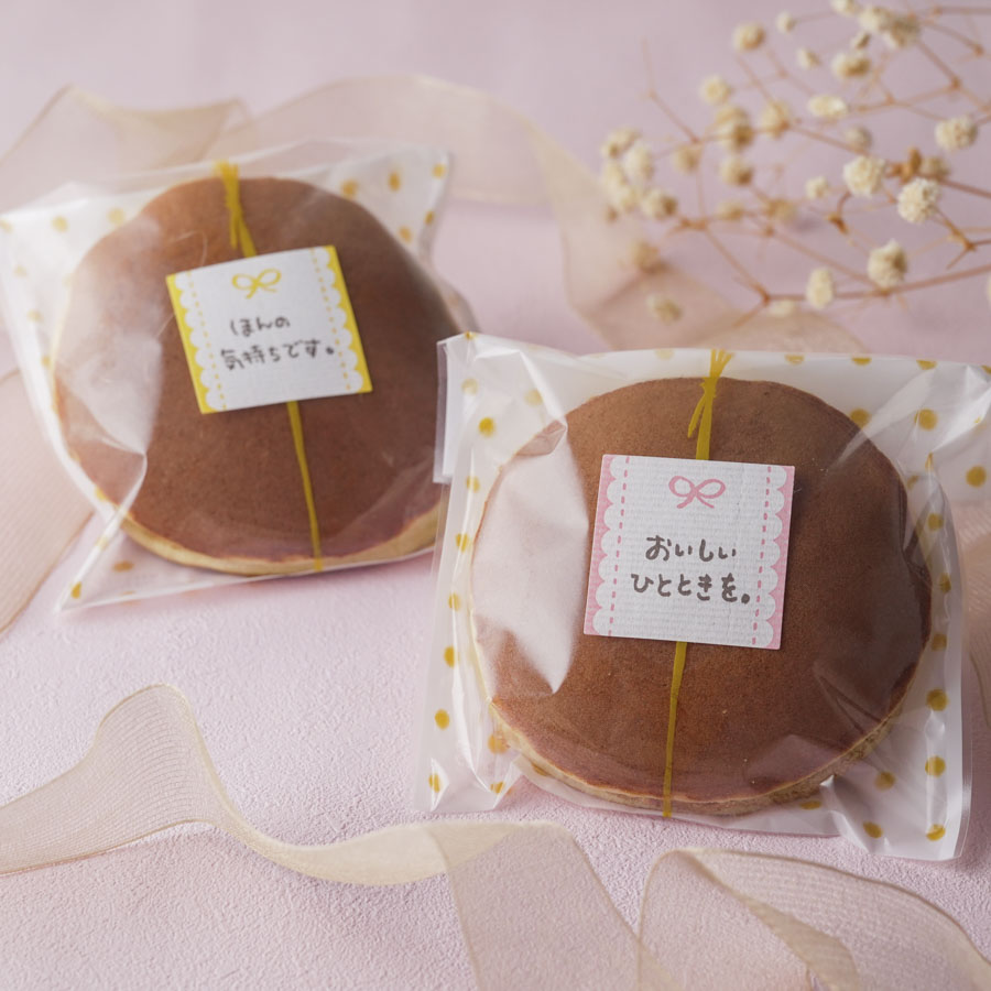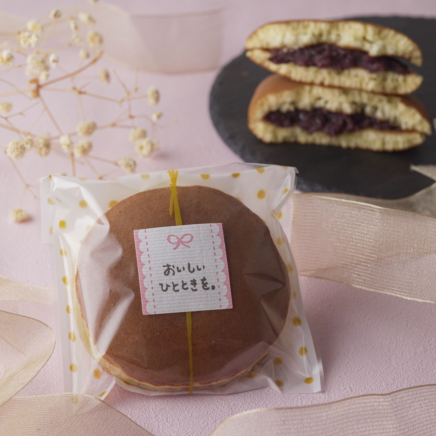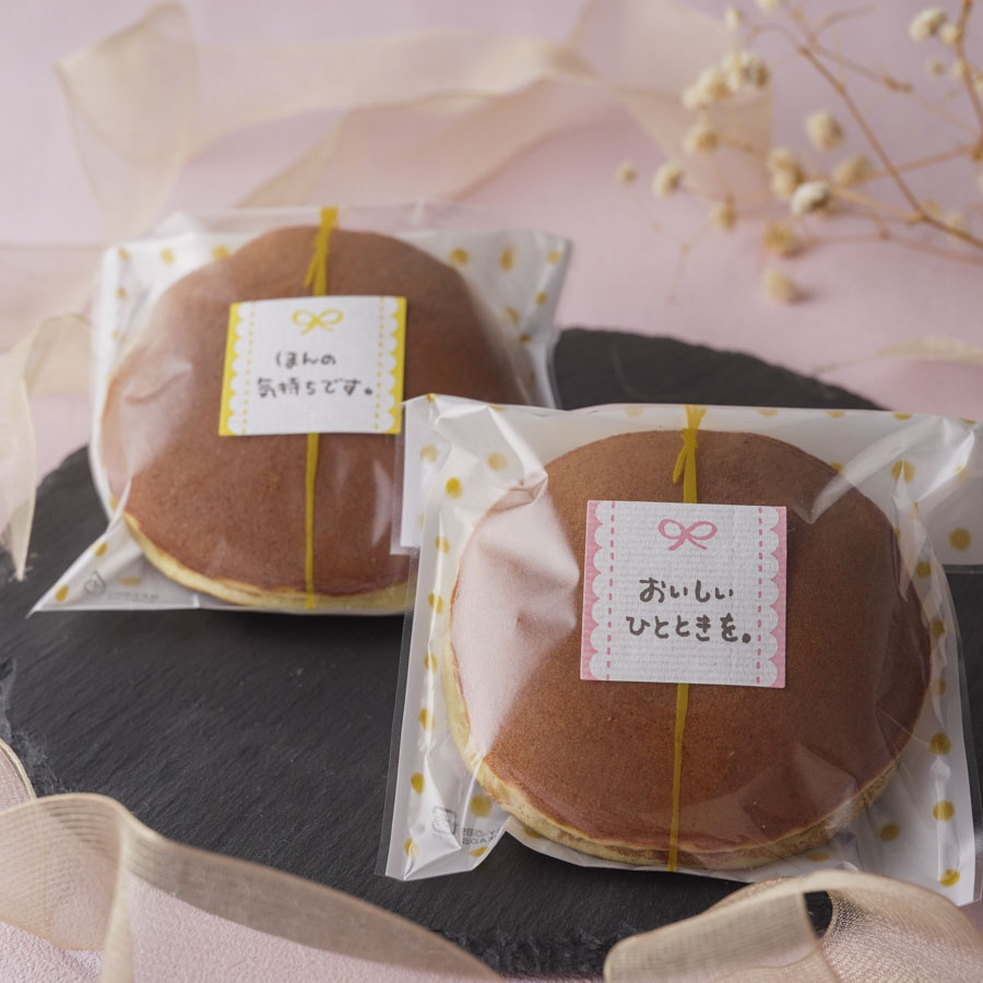 「おいしいひとときを」「ほんの気持ちです」のコメントが入ったギフトシールがアクセントのどら焼きのラッピング。