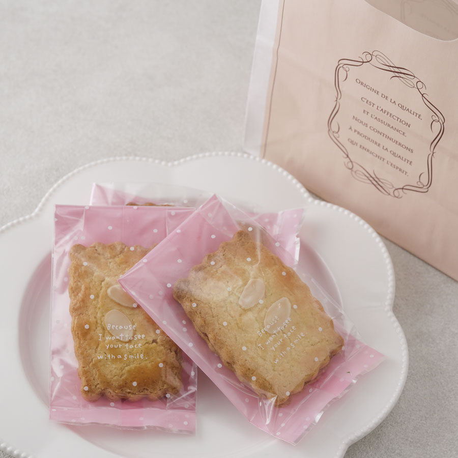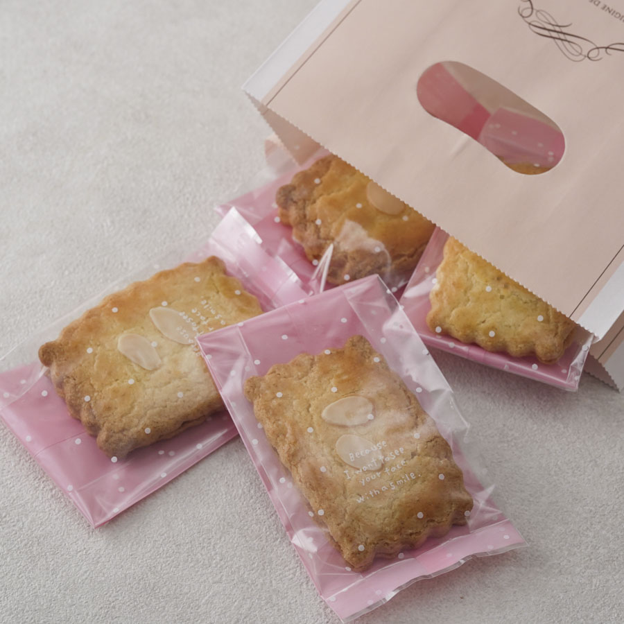 袋の開け口を後ろに折って長方形の透明シールを貼る。同じものをあと5個作る。