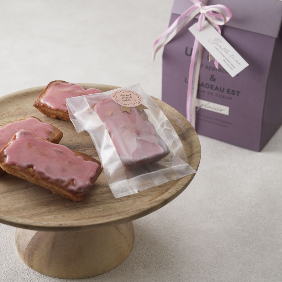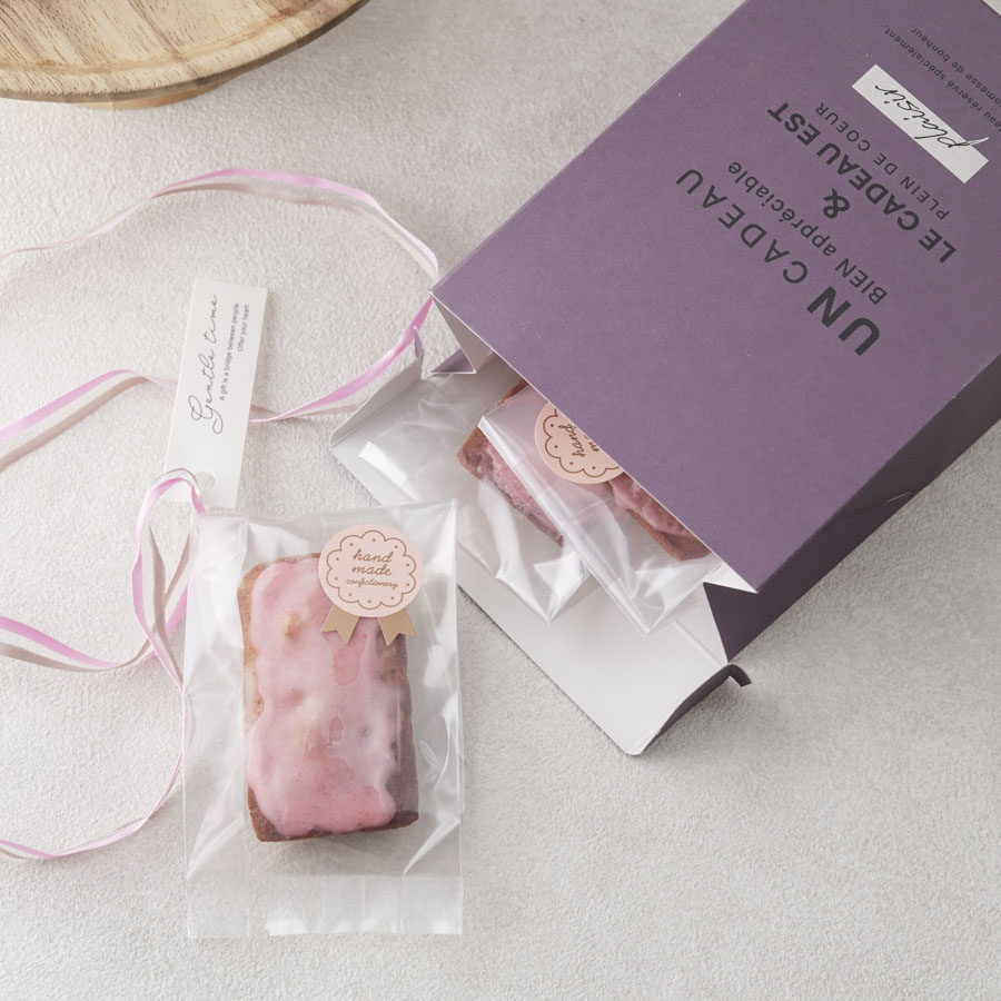 個包装にしたフィナンシェをシックな色味のギフトボックスに詰め合わせたラッピング。