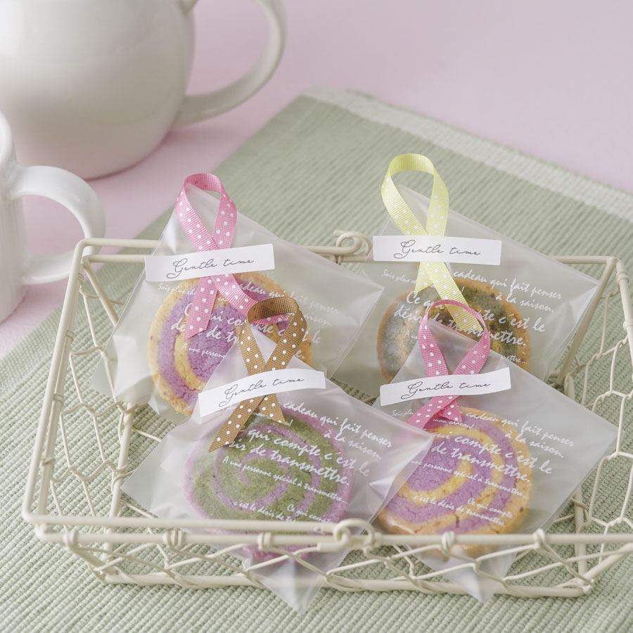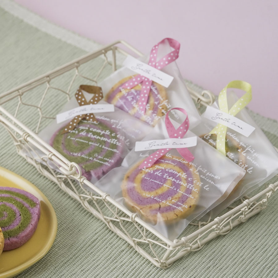 OPP袋とカラフルなリボンを使ったカラフルなクッキーのラッピング。
