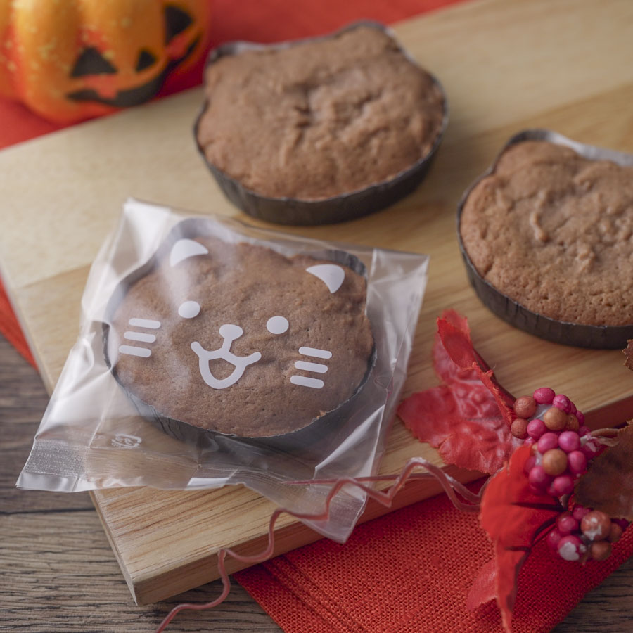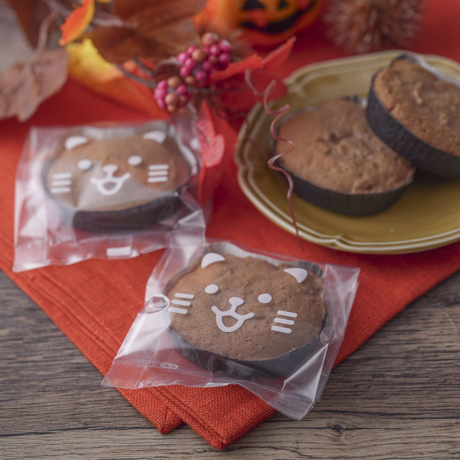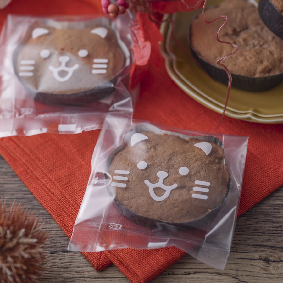 「スイートカップ ネコ」 で焼いたマフィンやカップケーキを奥まで入れて包むとケーキとネコ柄がぴったりとフィットする袋とカップを使ったマフィンのラッピング。