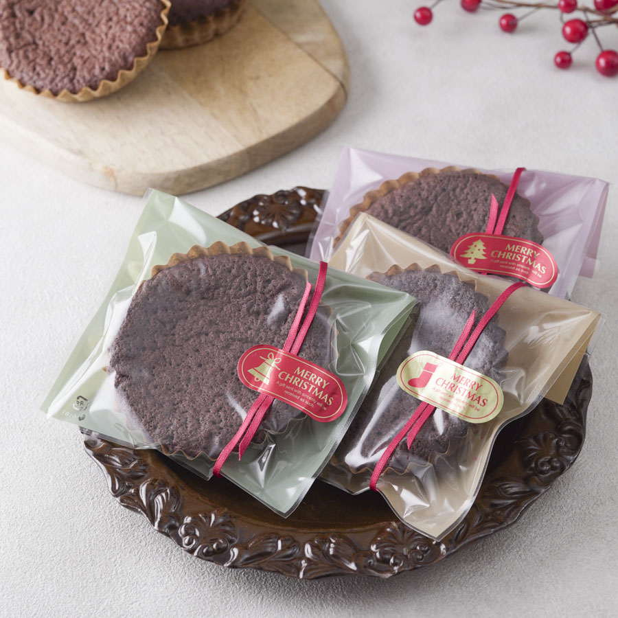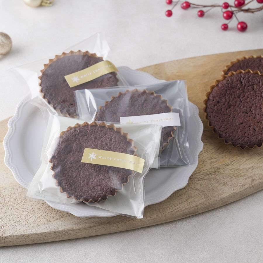 ガトーショコラの大きさに合わせて袋を後ろに折り、楕円の透明シールで止める。
