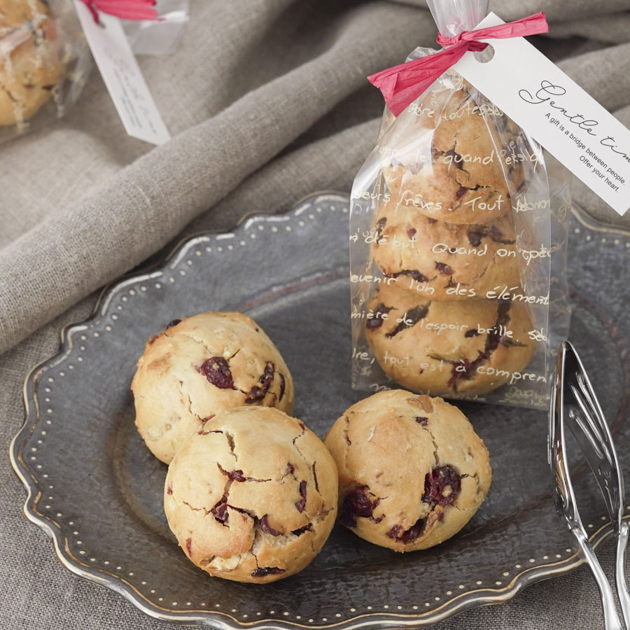 柄入りのクッキー袋を使ったスコッキーのラッピング。和紙タイに付けたタグがワンポイントです。