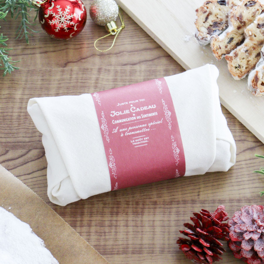 ラッピングクロスをひし形の向きで広げ、真ん中に12のシュトーレンを置く。