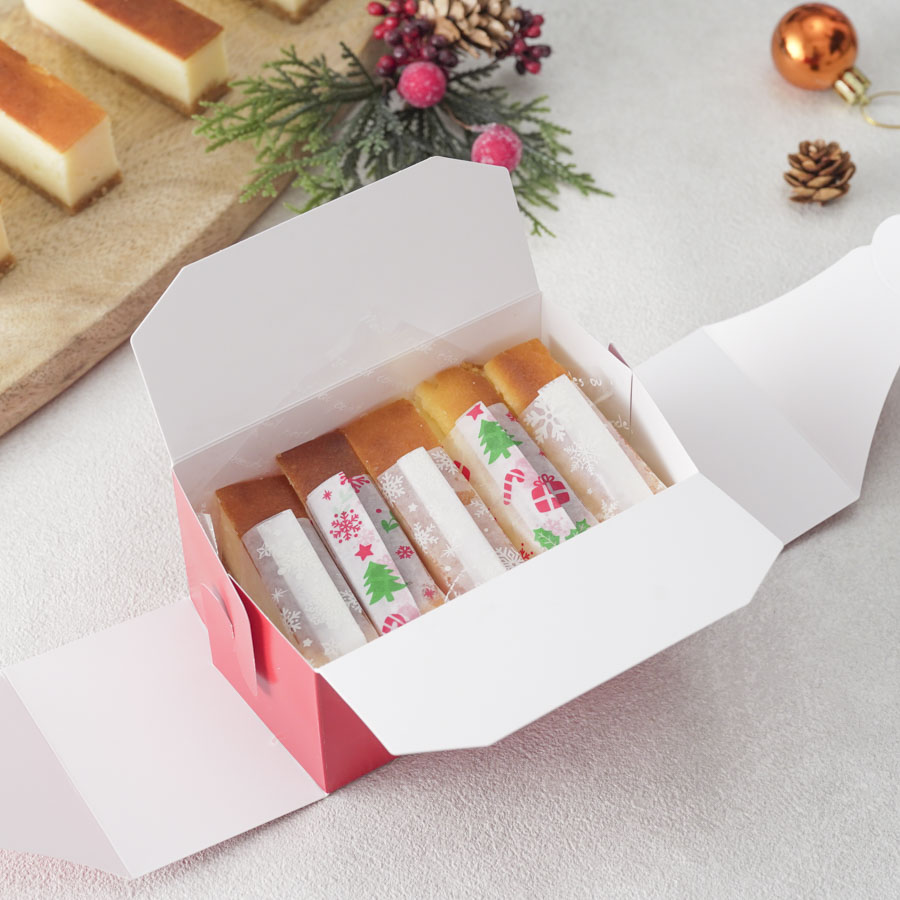 クリスマス柄のワックスペーパーで個包装にしたスティックチーズケーキをギフトボックスに詰め合わせたラッピング。