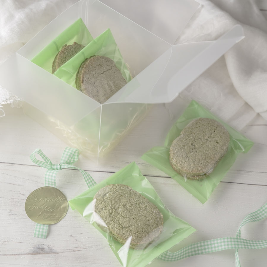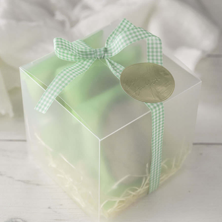 個包装のダックワーズを半透明のキューブ型ギフトケースに詰め合わせたラッピング。