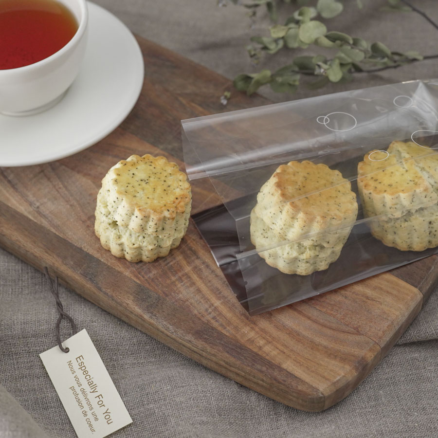縦長のOPP袋を使ったスコーンのラッピング。色付きのOPP袋なのでスコーンがよく映えます。