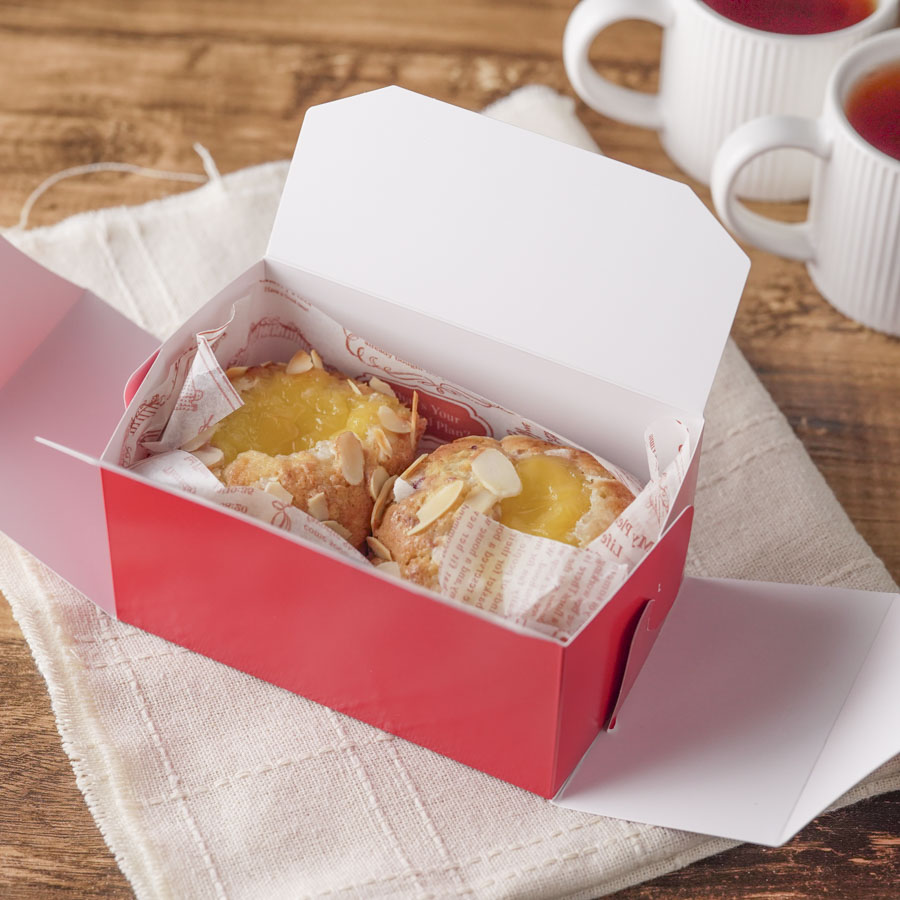 リバーシブルに使えるギフトボックスを使ったマフィンのラッピング。ワックスペーパーを敷いてラッピングするので油染みを気にすることなく持ち運びできます。