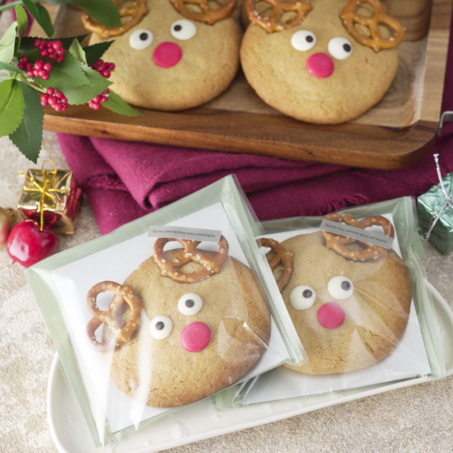 クッキー台紙を使ったトナカイクッキーのラッピング。台紙を使うと壊れにくく持ち運びも安心です。