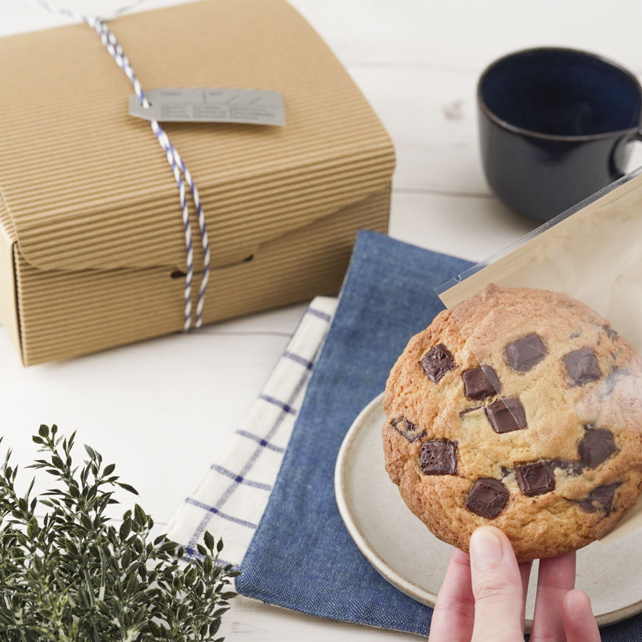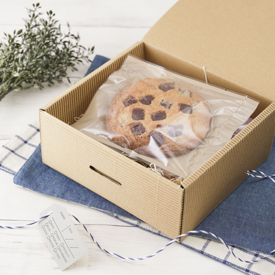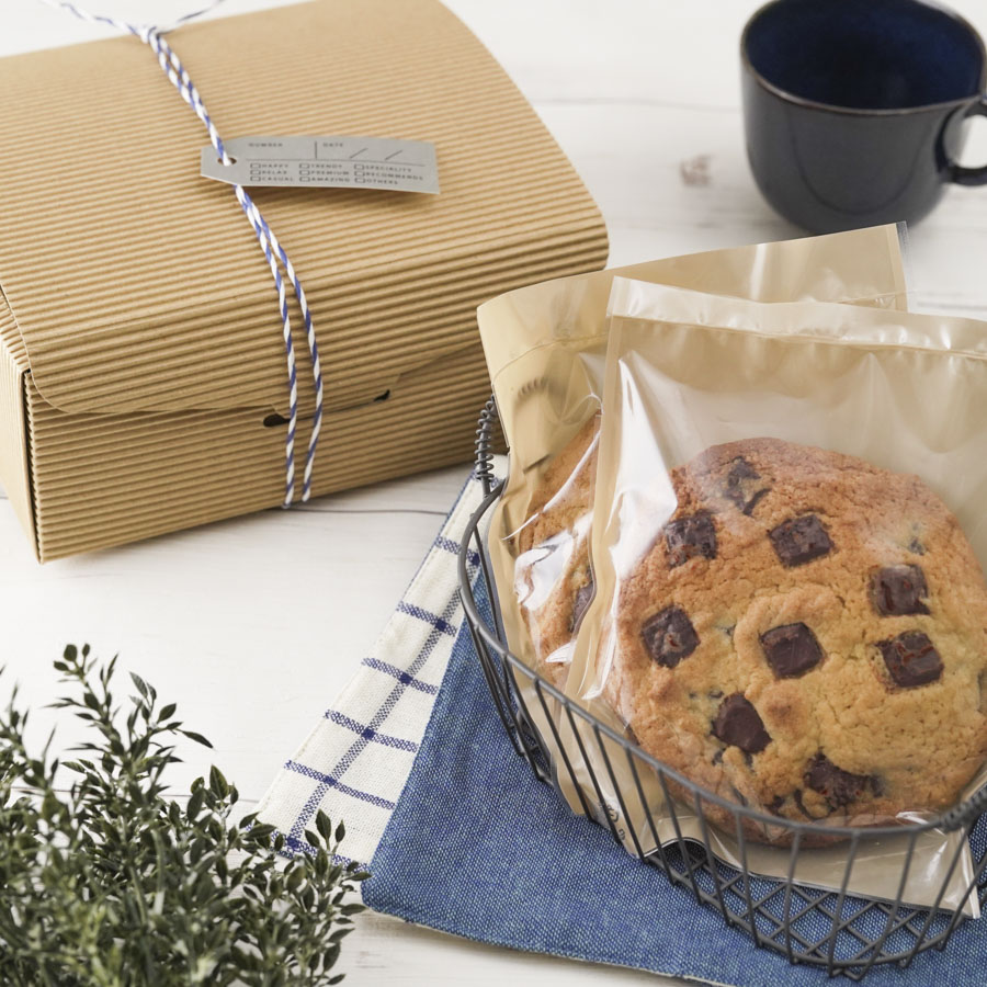 ナチュラルな風合いの箱に詰め合わせたクッキーのラッピング。