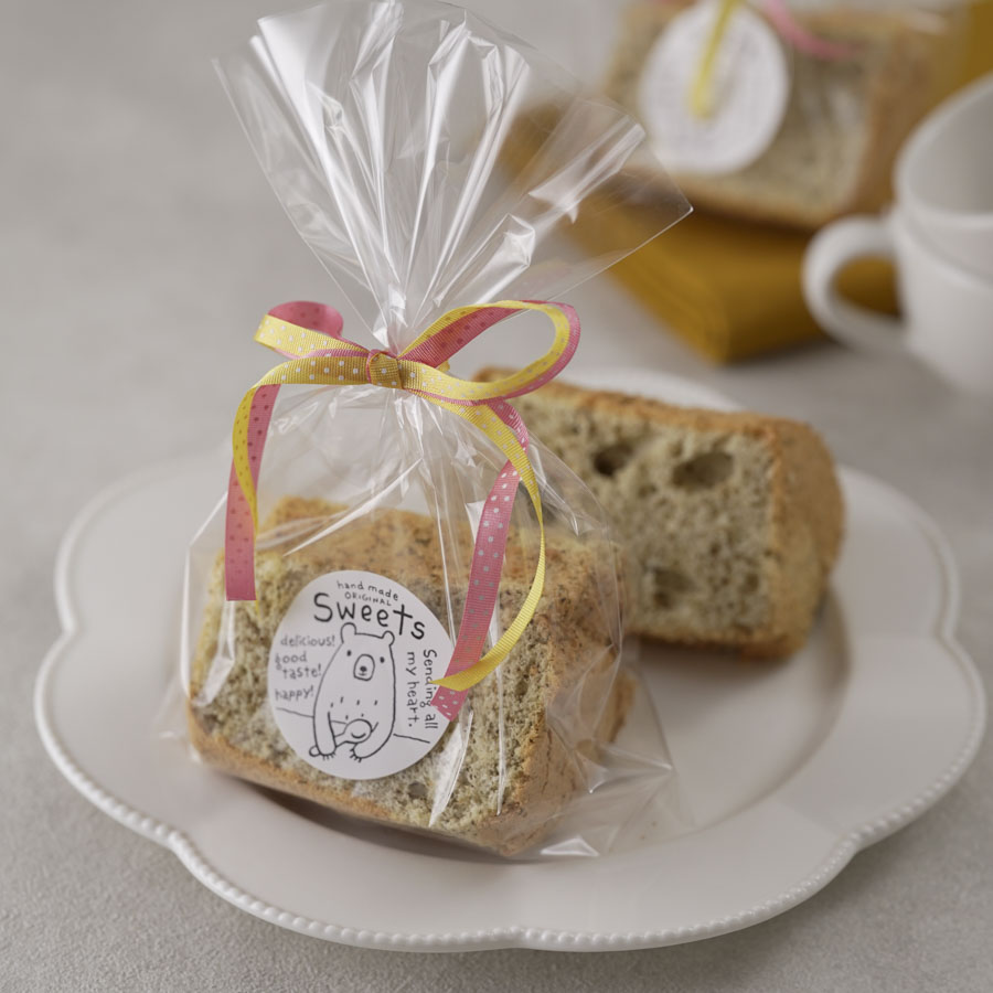 マチ付きの袋を使った紅茶のシフォンケーキのラッピング。ふんわりとしたシフォンケーキもつぶれづらく持ち運びしやすくなります。
