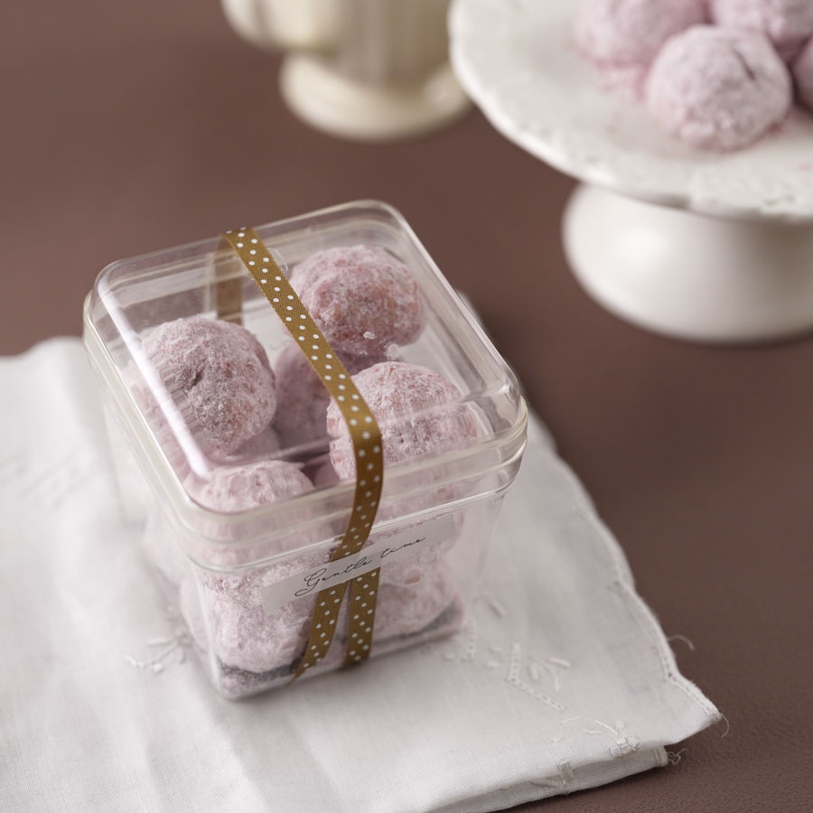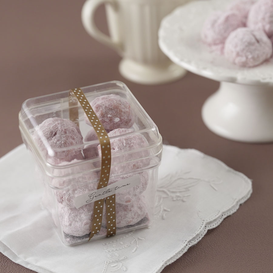 クリアケースを使ったブールドネージュのラッピング。ほろほろした食感のクッキーも崩れにくく持ち運ぶことができます。