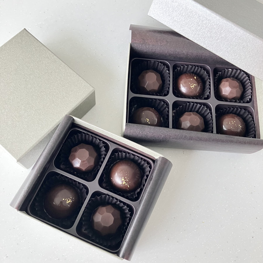専用のグラシンとボックスを使うだけで、ショコラトリーの仕上がりに。